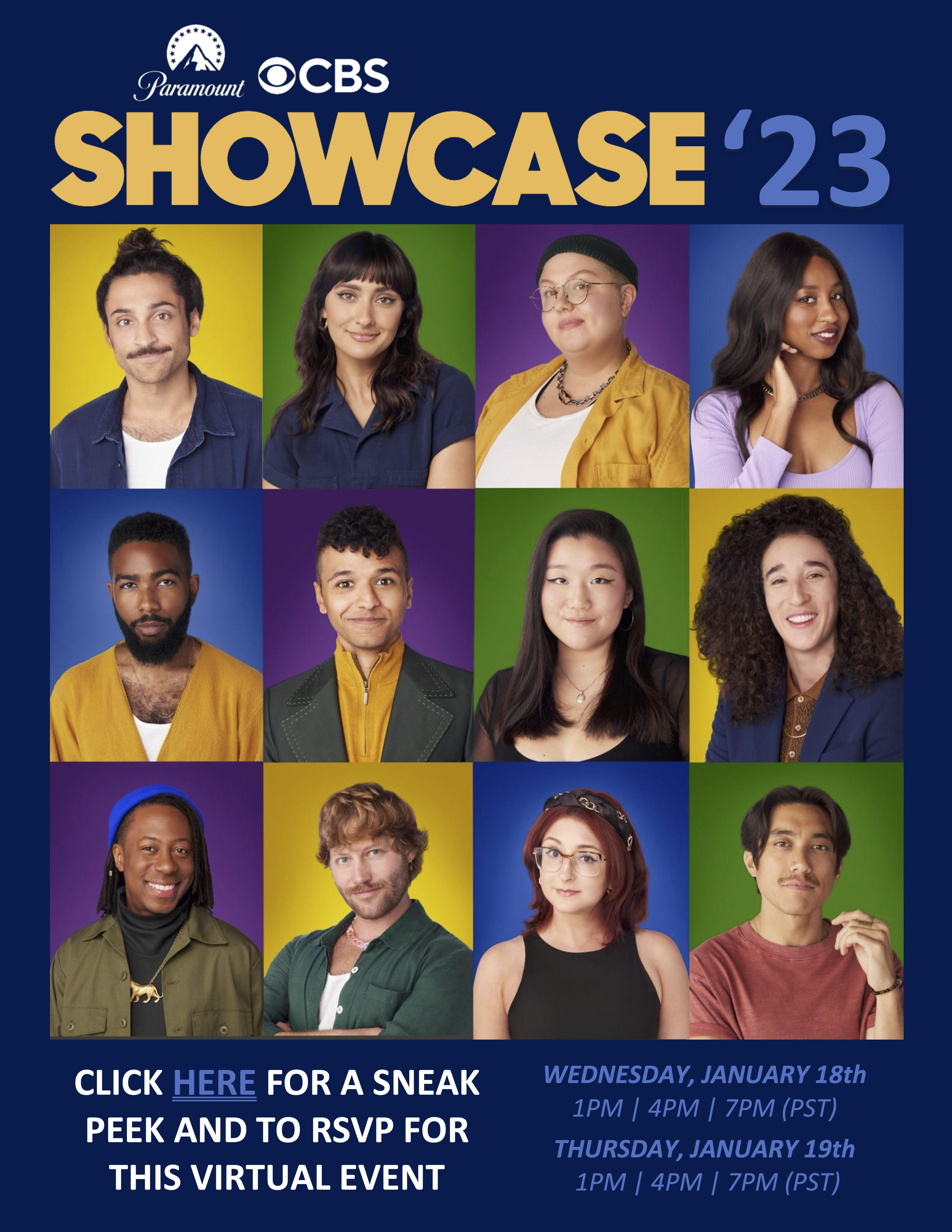 The 2023 CBS SHOWCASE, premieres with a Hollywood screening this Tuesday, and additional virtual screenings Wednesday, Jan. 18 and Thursday, Jan. 19 at 1:00 PM, PT, 4:00 PM, PT and 7:00 PM, PT. This year’s cast members include: Adisa Williams (Kingston, Jamaica), Alise Morales (Fairfax, Va.), D.J. Mausner (Toronto, Ontario), Evan Mills (Chicago, Ill.), Geoffrey James (Cleveland, Ohio), Jake Szczepaniak (Wheaton, Ill.), Jetta Juriansz (Scottsdale, Ariz.), Joseph Lymous (New Orleans, La.), Lorena Russi (Queens, N.Y.), Miya Kodama (Fresno, Calif.), Vinny Thomas (Denver, Colo.) and Zae Jordan (Atlanta, Ga.).