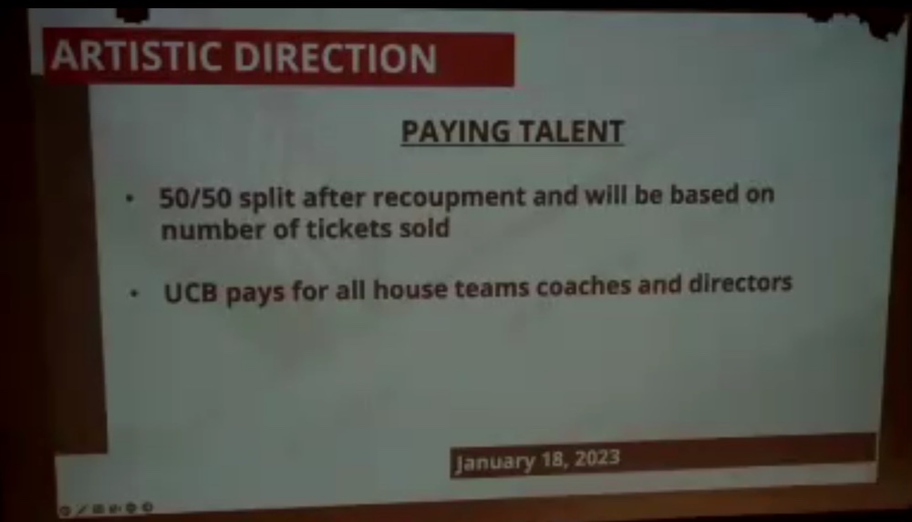 Earlier this month (Jan. 18), the new iteration of The Upright Citizens Brigade Theatre held a town hall both in-person in New York City and over Zoom, hosted by Solomon Hinton (head of People & Culture at UCB, hired in Fall 2022, formerly with Studio71 and The Collective) including new owner Mike McAvoy and the new UCB-NY artistic directors. They spoke about relaunching in NYC (still looking for a suitable space), creating an actual HR environment for hiring, discipline, diversity and whatnot, and MONEY!