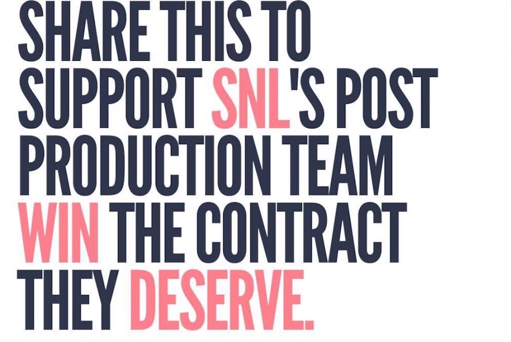 The Motion Picture Editors Guild came out last week in support of the newly organized film unit at NBC’s Saturday Night Live, who piece together the pre-taped short films for SNL in post-production, and who voted to form a union in October. They have yet to sign a contract with NBCUniversal. As MPEG (heh heh) stated last week: “The editorial crew of @nbcsnl’s film unit works long hours under intense pressure, bringing pre-shot skits to the screen in record time. But @NBCUniversal seems in no hurry to make a deal. The crew is standing together to demand a contract now!”