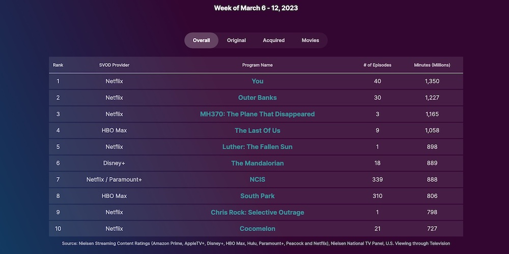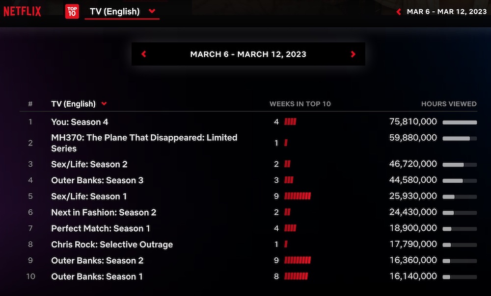 For the next full week of Nielsen measurement (March 6-12, 2023), Chris Rock’s new hour pulled in an additional 798 million minutes (13.3 million hours), ranking ninth on Nielsen’s overall streaming report.