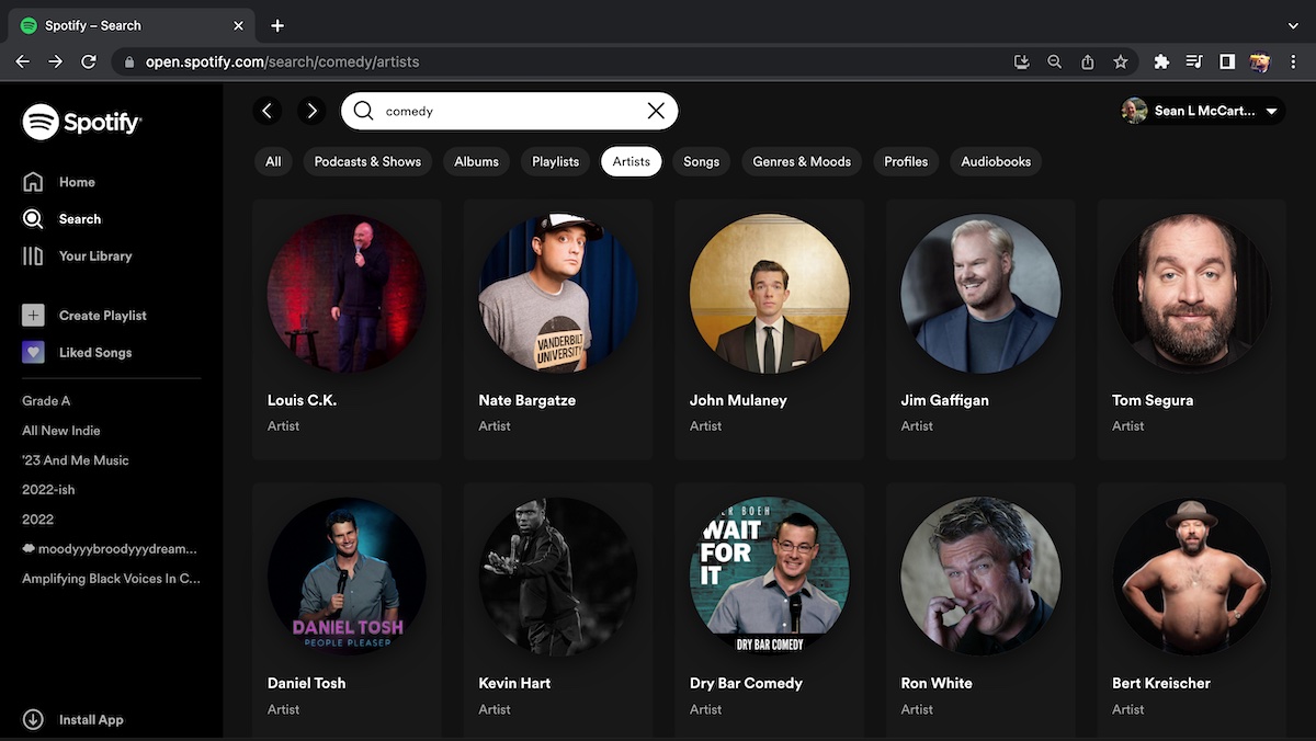 Apple, though splitting Music and Podcasts into separate apps, still has specific genre pages for comedy albums and comedy podcasts, plus continually updated charts for the most popular tracks, albums, and podcast episodes. SiriusXM, which also owns Pandora, operates their own niche radio stations tailored to whatever kind of comedy you’re into, either spinning new comedy tracks your way via DJ or via algorithms. But Spotify? Searching for comedy only pulls up albums and tracks with comedy in the title, and the artists page just shows me a collection of high-profile dudes. I don’t know why Spotify chose these particular comedians. I certainly haven’t been giving them hints in the direction they chose (not that I don’t enjoy them, but still, just the facts here).