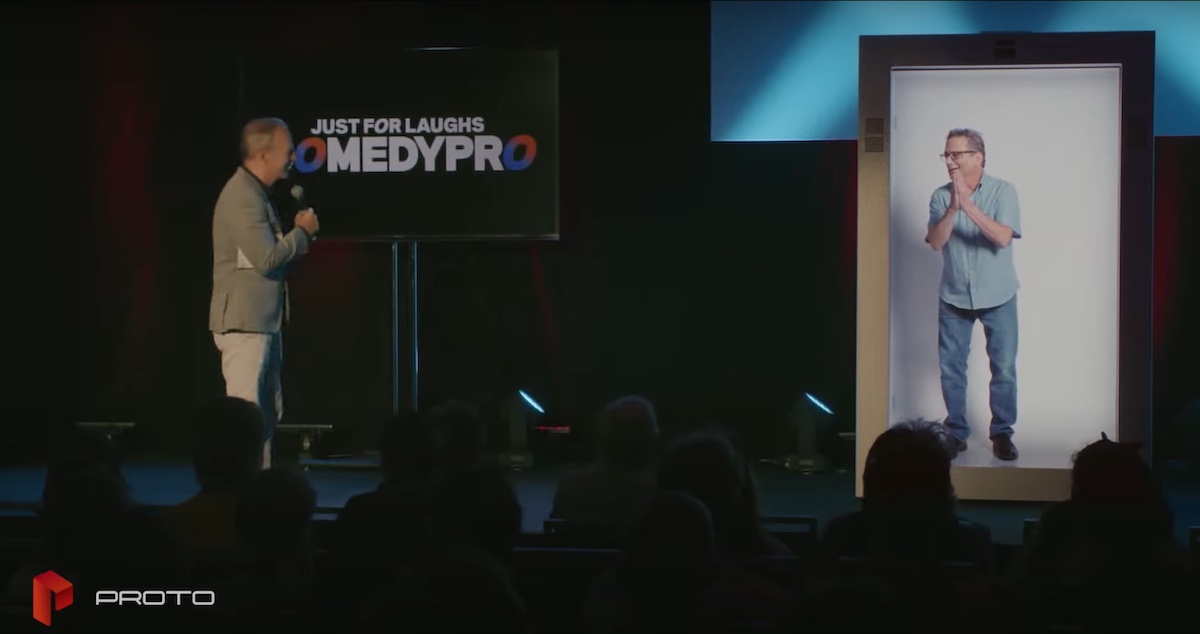 Kindler began delivering his roast of the comedy business in front of the comedy business at the 1996 JFL festival. When the pandemic hit, making Montreal go virtual, so did Kindler’s speech, broadcast as a livestream. In 2021, though, with JFL still not quite all in Montreal, livestreaming New Faces and other shows from Los Angeles, Kindler hosted his usual Alternative showcase, but didn’t deliver his usual address. Last year, Kindler stayed in Los Angeles, but beamed back to Montreal via a Proto hologram unit — allowing him to stand in Proto’s L.A. studio while hearing and interacting with the live audience in Montreal, including Bob Odenkirk, who introduced Kindler.