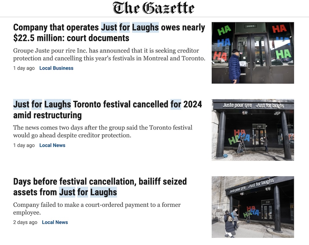 No matter what any individual comedian tells you about their personal experience with Just For Laughs or specifically with Montreal and that festival — it turns out they were bleeding money more than anyone could’ve guessed? Unless you were the guy who JFL founder Gil Rozon had promised a lifetime job to, and after Rozon sold out in disgrace, the new owners canned the guy, who took JFL to court and won his case, resulting in a…get this…$850,538.26 order last week to pay archivist Andre Gloutnay for lost wages since his layoff through retirement age.