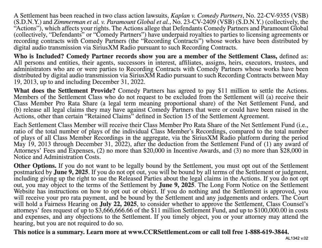 Eligible comedians don’t have to do anything, but do have a June 9 deadline if they wish to opt-out or otherwise challenge the settlement, with the court holding a final fairness hearing on July 22.