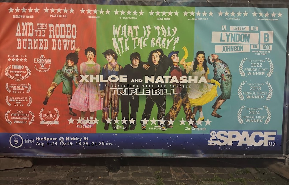 Xhloe Rice and Natasha Roland met in high school in Maryland and have been making magical two-handed theater shows ever since. Now based in New York City, they have taken three shows to the Edinburgh Fringe since 2022, winning The Scotsman’s Fringe First Awards for writing for each of them: And Then The Rodeo Burned Down; What if They Ate the Baby?; and A Letter To Lyndon B. Johnson or God, Whoever Reads This First. At the end of 2025, they also began debuting their latest work-in-progress, The Doctor Was His Mother, which ditches their usual narrative arcs and sociopolitical commentary for some simply silly and laugh-out-loud physical comedy. Their work always blends absurdist clown work, modern dance and satire in a way that separates them from most of their peers working onstage today. In December 2025, they’re enjoying an encore run of What If They Ate The Baby? at the SoHo Playhouse in Manhattan, and joined me over Zoom from their dressing room backstage to talk about their writing process, how they had to gamble on themselves in Edinburgh before gaining any real exposure in the States, and what sets them apart from the rest of the clowns currently influencing the comedy scene in the mid-2020s. There’s a lot to get to, so let’s get to it!